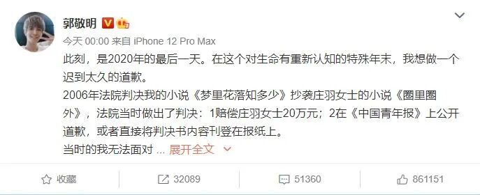 就在12月31日凌晨,郭敬明发布了道歉微博,正式向作家庄羽道歉。2006年,北京高院作出终审判决,郭敬明的作品《梦里花落知多少》对庄羽的《圈里圈外》构成抄袭。但十多年来,郭敬明一直拒不道歉,而这也成为他不断遭到口诛笔伐的一个原因,并最终引发了影视圈上百名编剧联名抵制的风波。