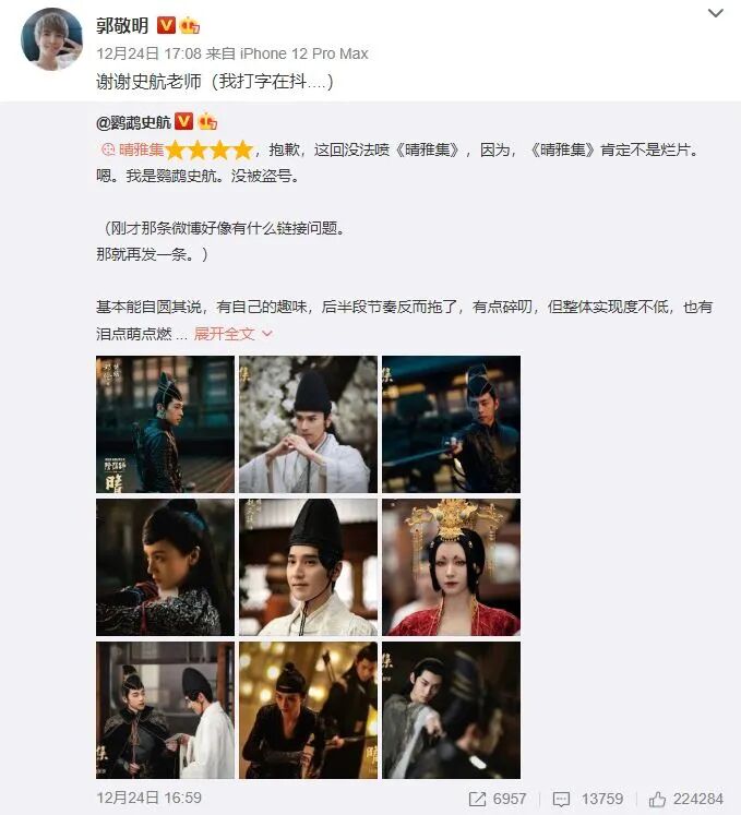 令人啧啧称奇的事情不止这一件。12月24日,知名编剧鹦鹉史航为《晴雅集》打出了四星(满分五星)的评分,并直言“《晴雅集》肯定不是烂片”、“看不到别人的进步,就是我的退步”。