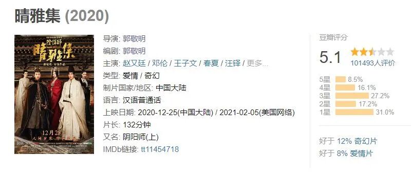 目前,《晴雅集》是郭敬明评分最高的电影。即便是在豆瓣,《晴雅集》依然取得了6分的开画评分。只是如今,评分已经跌倒了5.1分。