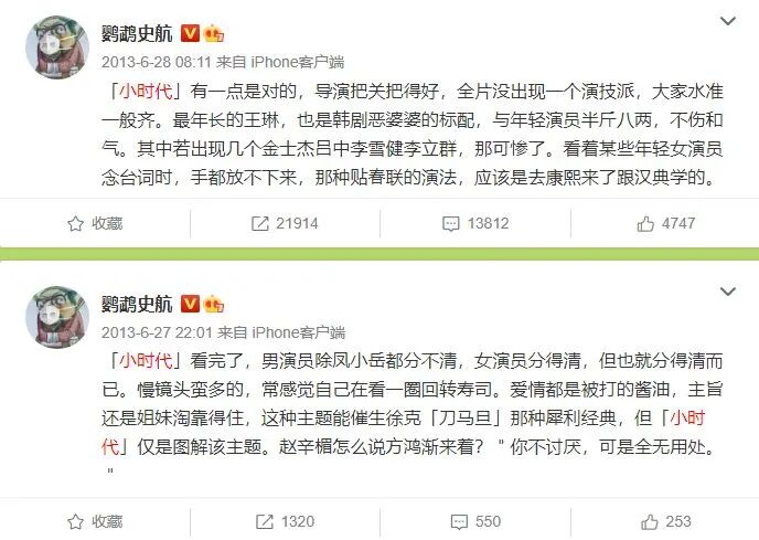 可能年轻读者不知道,史航曾经和郭敬明有过一段恩怨。在《小时代》上映的时候,史航曾经连发多条微博,对这部电影大加批判,并引发了一轮网络骂战。彼时的史航更是直言,郭敬明的选角十分“正确”,整部影片没有一个演技派。