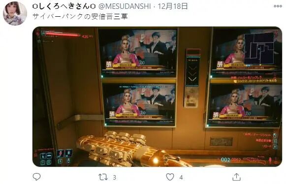 在《赛博朋克2077》中,CDPR制作了许多电视节目,除了那些色情暴力的赛博广告以外,还有上面这种用以交代故事背景的新闻节目,有日本玩家就在游玩过程中,发现新闻报道里竟然出现了疑似安倍晋三的彩蛋,并且根据设定,这个长相酷似安倍的人还是一名军工企业康陶公司的高管。