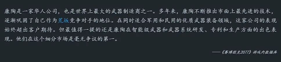 根据VG百科的介绍,在《赛博朋克2077》游戏背景设计中,康陶是一家华人公司,也是世界上最大的武器制造商质疑,康陶还是游戏中最大的反派——荒坂公司的竞争对手,目前康陶公司的总部坐落在沈阳,是一家血统非常纯正的中国企业。