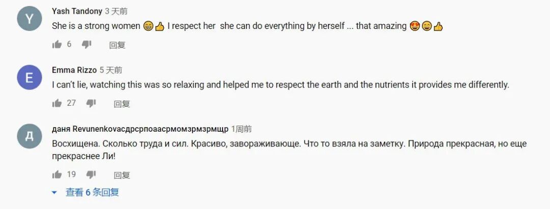 不仅如此,国外网友对她的评价,也是非常高,称她为“来自神秘东方的仙女”。在李子柒视频的外网评论区,你能看到大量外国网友的彩虹屁,足见他们对李子柒以及其代表的中国文化,有着极其浓厚的兴趣。