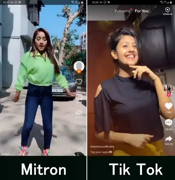 也有在软件UI界面设计上,对Tik Tok进行大规模“致敬”的“Mitron”,单从截图来看,它和Tik Tok简直是从共同一个模子里刻出来的。