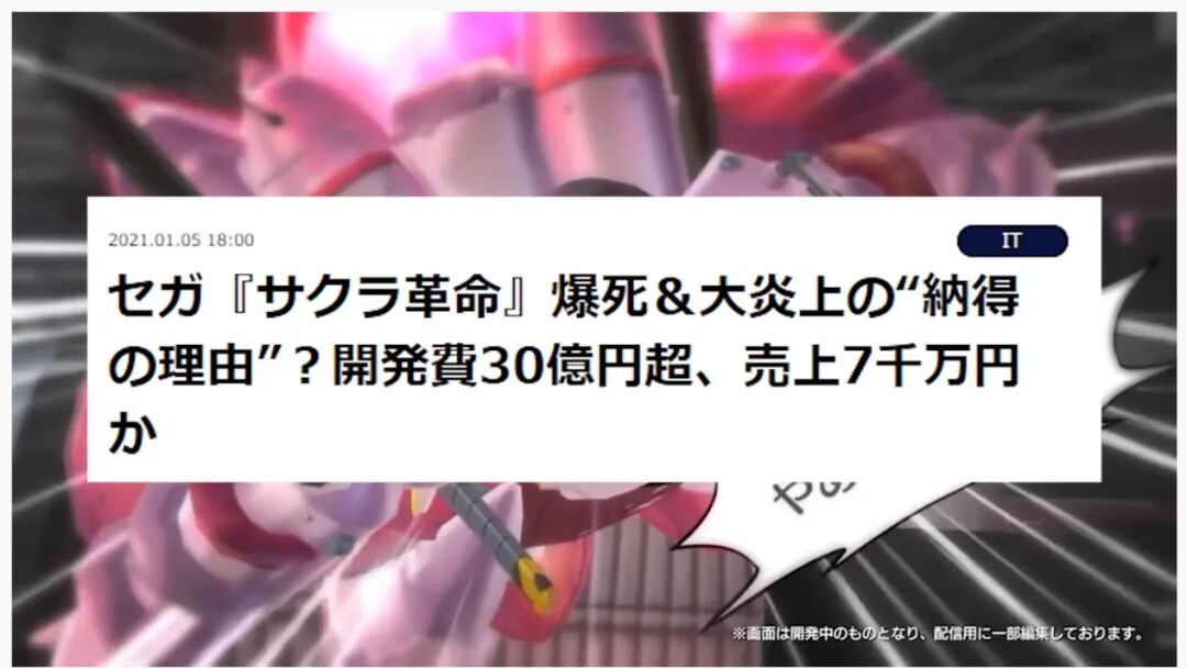 2021年1月5日,就在“樱花革命”顶着各界质疑,正式配信的半个多月后,一篇名为“世嘉《樱花革命》暴死&炎上的‘合理理由’?开发费超过30亿,营收仅有7千万”的报道引爆了网络舆论,在人们纷纷谴责世嘉和“DW”的同时,事情也正在逐步失控。