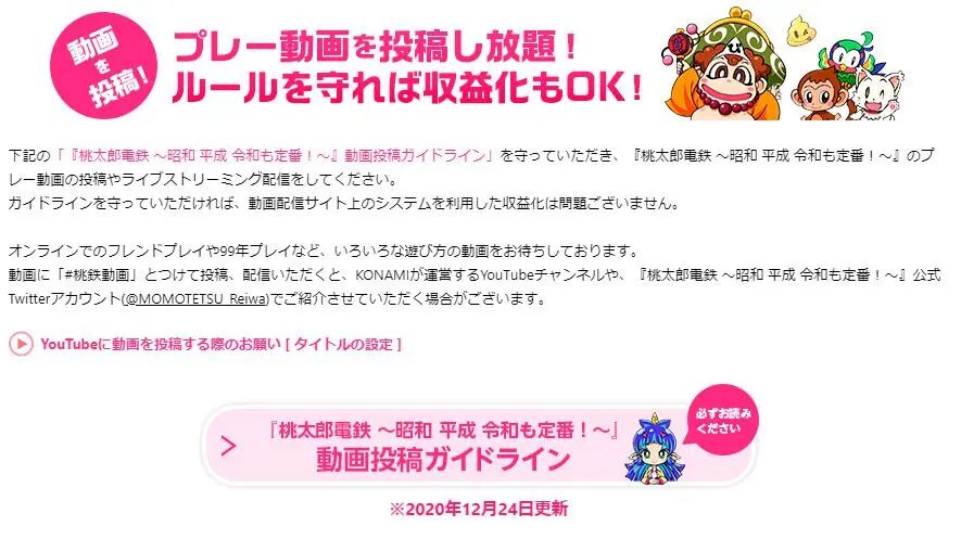 以近期最火的NS游戏,《桃太郎电铁~昭和平成令和也是惯例~》为例,版权方对直播行为持支持态度,并且对于收益化一事,显得也非常宽容。