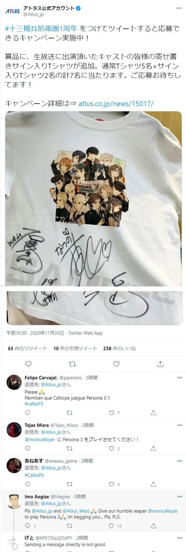 很快,森美声的粉丝们便开始响应号召,通过各种方式向ATLUS喊话,但是比起“请求”,这时的他们表现得,更像是在“施压”。很快,ATLUS的官方账号,被前来请求的粉丝挤满,其中甚至包括不少,和“女神异闻录”毫无关系的推文。