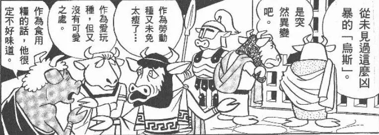在《牛头族之食桌》故事里,主角在太空飞行时发生事故,迫降到了一个牛头人饲养人类的星球。在这里,牛头人和人类的地位,就像现实中人类和牛的地位——饲养者和被饲养者。