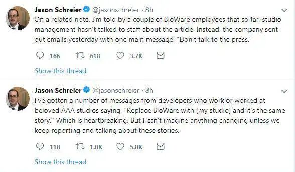 事件持续发酵,在BioWare发布道歉声明后,隔天Jason Schreier再次发文,矛头依旧直指BioWare,称有BioWare内部员工反馈,在发布声明后,BioWare管理层并没有及时更正公司管理上存在的错误,反倒是通过邮件的形式,命令员工不得再与媒体沟通。