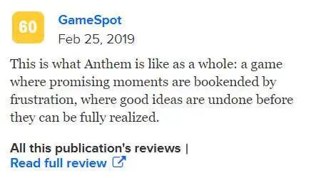 在正式上线的数十小时前,《圣歌》的媒体评分已经悉数出炉。尽管有着BioWare金字招牌的庇佑,但《圣歌》首发的媒体评分,却依旧让人大跌眼镜。在评分网站Metacritic上,游戏的首发媒体均分只有67分。其中Gamespot和IGN都只给本作打出了刚刚及格的分数。在详细说明中,Gamespot指出,本作确实有着一些非常不错的想法,但可惜在开发过程中并没有将这些想法很好地执行起来,游戏中的大量内容生硬且无聊。而IGN则表示,本作在怪物种类、数值平衡和游戏优化上,都还有很长的路要走。