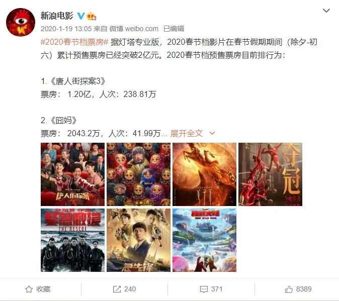 2020年1月19日,春节档预售开启。《唐人街探案3》首日预售超过1.2亿创纪录,而排名第二的《囧妈》预售只有2043万。其余六部影片预售票房加起来,也没有《唐人街探案3》高。
