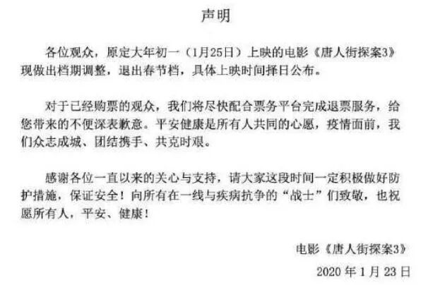 2020年1月23日,众多影片纷纷撤离春节档,择日再映,包括《唐人街探案3》。