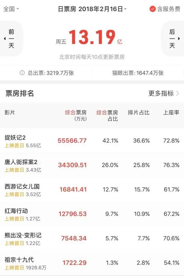 这一年的春节档,堪称“死亡小组”。梁朝伟、白百何主演的《捉妖记2》得到院线力捧,首日票房破6亿,排片占比36.6%,一骑绝尘。《西游记女儿国》也被寄予厚望,《熊出没·变形记》则占据着儿童市场。