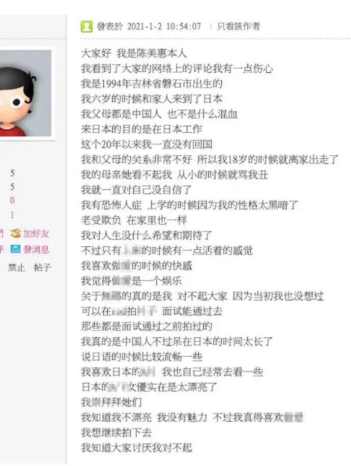 网上流传着一张疑似陈美惠本人的长篇回复,文中透露她6岁随父母来到日本,但父母一直不喜欢她,导致她在18岁那年离家出走。可以说,原生家庭的悲剧,改写了陈美惠今后的人生。