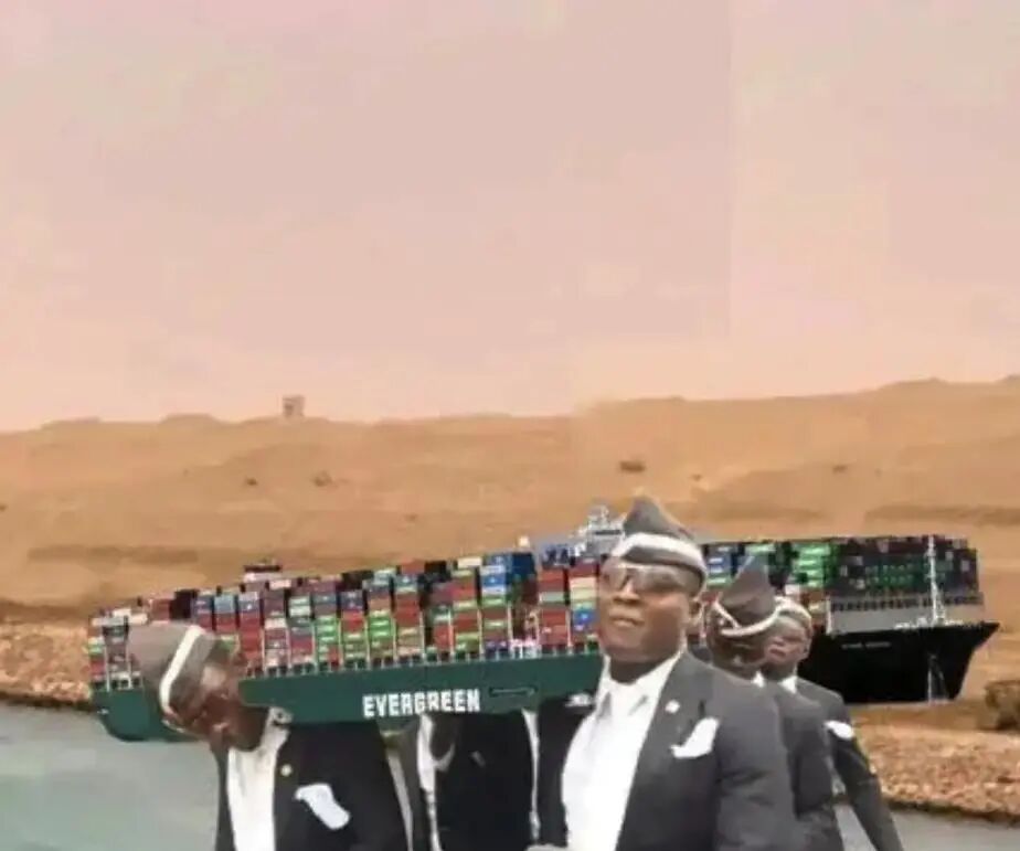 还有人吃下回忆莓,想到之前红遍全网的“黑人抬棺”,提议让已经“抬遍万物”的黑人小哥们直接把“长赐号”给抬走,再请个白事队吹个唢呐助助兴,估计整条苏伊士运河上的船员都得闻者伤心见者落泪。