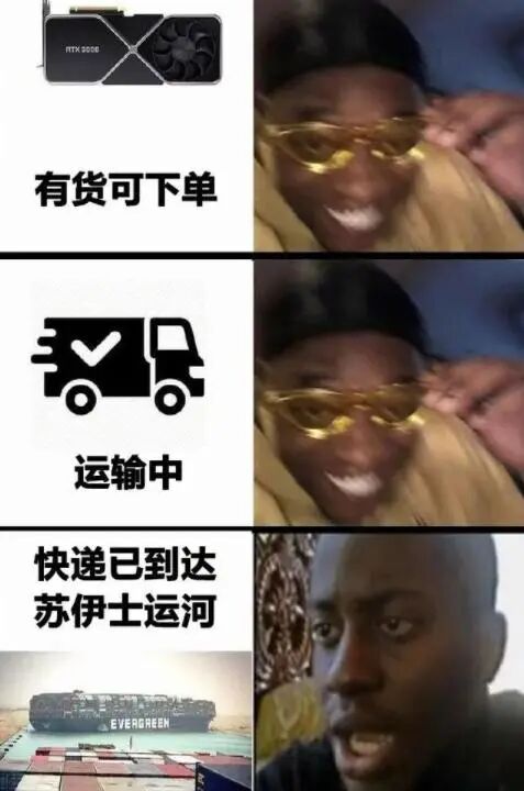 有网友因为在“人牛大战”中失败,无法抢到RTX 3080显卡,魔怔到试图让自己相信其实早已经抢到了RTX 3080显卡。只不过,刚出厂的RTX 3080显卡现在正在某艘位于苏伊士运河的船上。