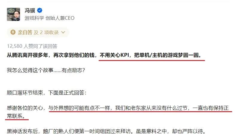 随后,游戏科学创始人兼CEO冯骥,在知乎发文证实了这一消息。冯骥在文末表示,“情怀很贵,穷山恶水。取经很难,需要同伴”,并喊话腾讯出来回应。