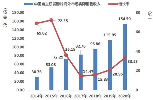 2020年,中国自主研发游戏在海外市场实际销售收入达154.50亿美元,比2019年增加了38.55亿美元,同比增长33.25%,继续保持高速增长态势。可以预见,接下来的几年仍将是国产游戏出海的黄金时代。