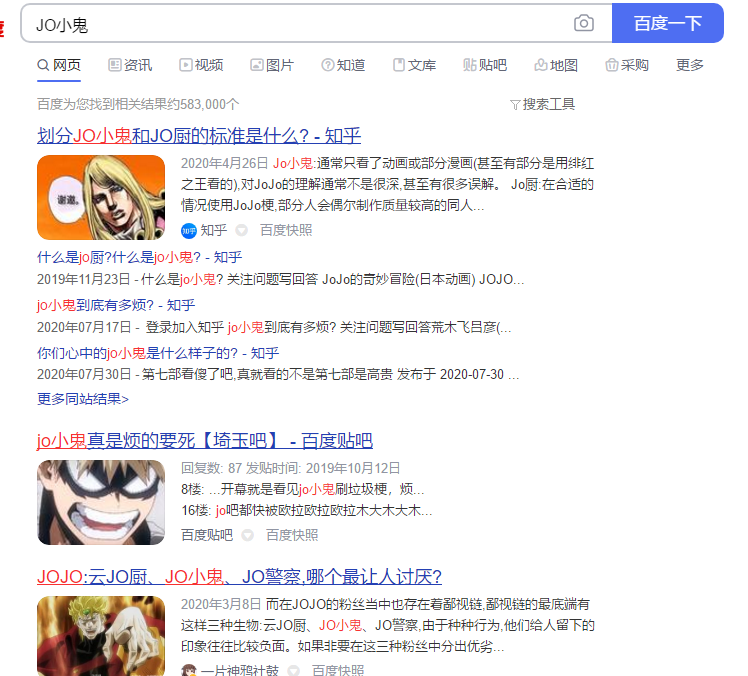 对于这些喜欢滥用JOJO梗的人,网友大多称呼他们为的“JO小鬼”。如果在网络上搜索“JO小鬼”,出现的内容大多是相当负面的信息反馈。