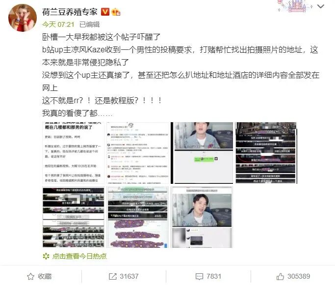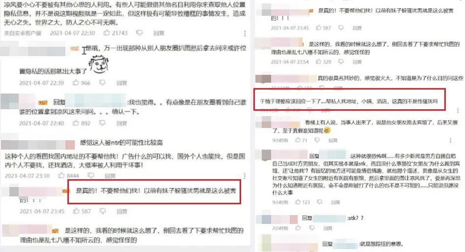 有网友指出,凉风Kaze的行为,已经涉嫌侵犯他人隐私。也有人指出,当事人所提供的照片来自女神朋友圈,而且没想到竟然是在宾馆拍的。大家纷纷质疑,男子寻找照片拍摄地点的目的是否不纯?会不会对照片的拍摄者造成伤害?甚至引发性骚扰?