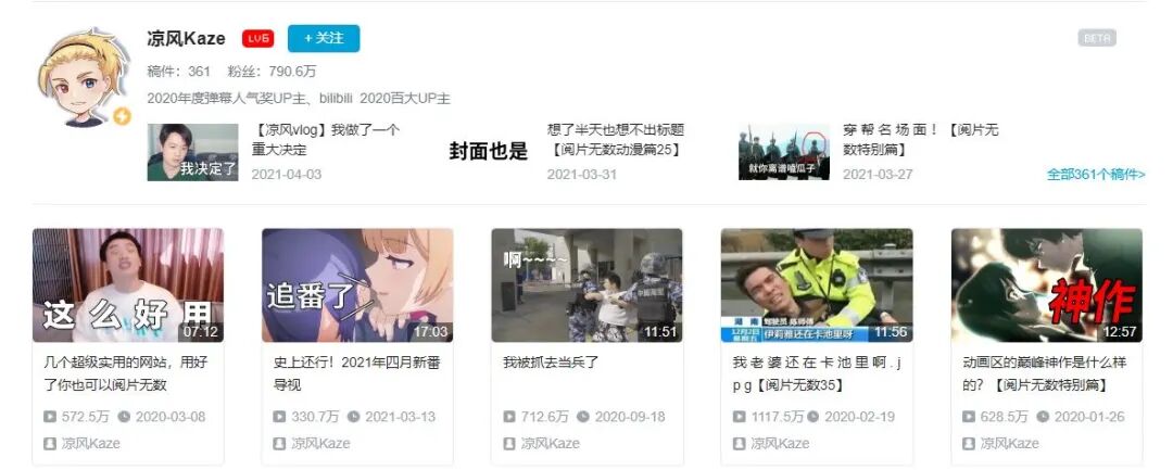凉风Kaze是B站2020百大UP主之一,也是2020年度弹幕人气奖UP主。他所发布的视频极具个人风格,其中“阅片无数”系列,每周三晚固定更新。该视频通过接受网友投稿,寻找各种奇奇怪怪的图片的出处,内容诙谐幽默。投稿的方式也不局限于具体的图片,甚至可以纯文字描述。