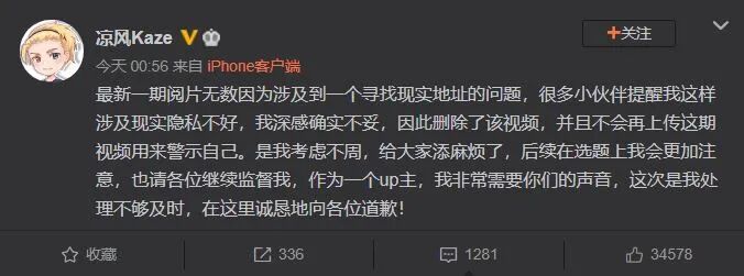 4月9日凌晨,凉风Kaze发布了道歉微博,正面回应了此事,向大众进行了解释。