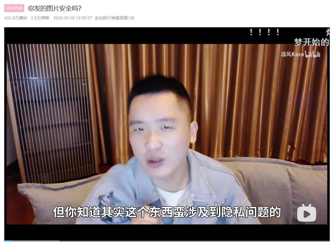 更为讽刺的是,就在一年前,凉风Kaze曾制作过一个标题为“你发的图片安全吗?”的视频,直指图片泄露隐私的潜在危险。视频中援引了一个发生在日本的真实案例,一个粉丝根据偶像瞳孔里的倒影,找到了这名偶像并对其实施犯罪。
