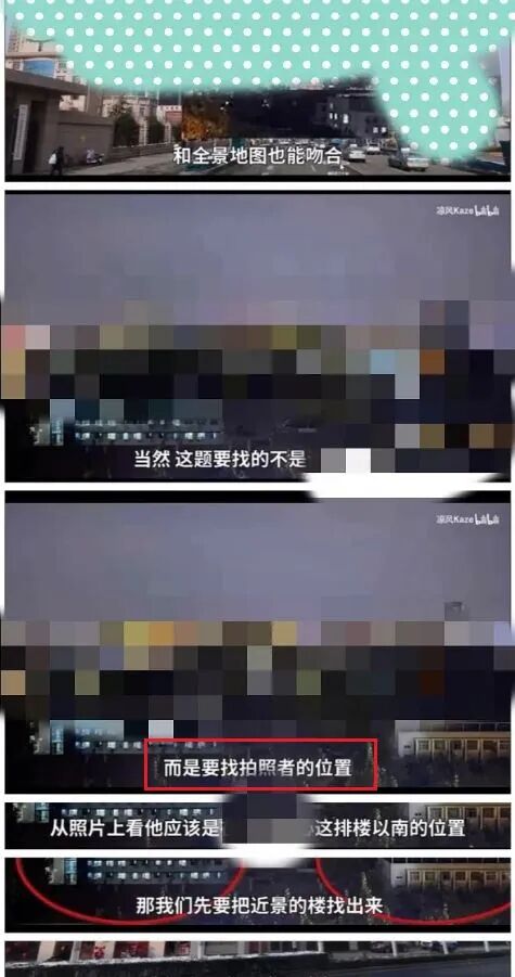 随后,凉风Kaze一步一步演示了如何寻找拍照者的位置,并成功找到真实地点。其中的细节,甚至涉及到了订房软件里面网友的评论晒图,具体到了拍照时所在的楼层。