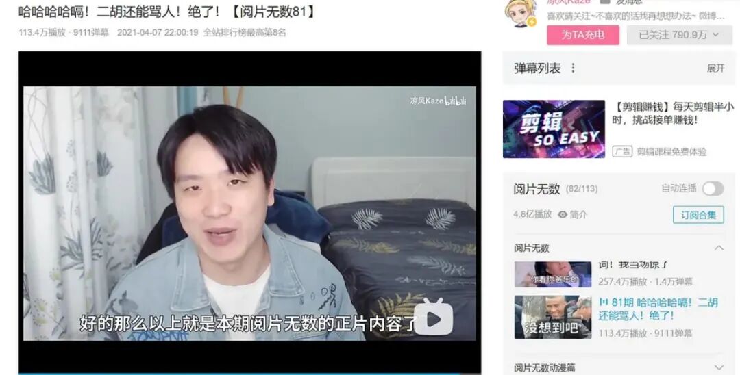 经过一段时间的发酵,“阅片无数81”收获了超过100万的播放量,冲到了全站排行榜第8名。对于凉风Kaze而言,这些数据只是基本操作。他过往的视频,播放量可以达到数百万。直到4月8日晚间,过了将近一天之后,凉风Kaze才将视频删除。目前,B站已经无法搜到这部视频。