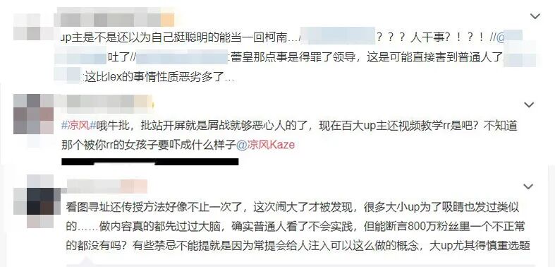 就像部分网友说的那样,有些内容不宜在公共场合讨论,是因为容易出现上行下效的现象。侦探小说中,作者会故意在犯罪过程中留下BUG,让其不具备可被效仿的可能。然而不管是LexBurner的网络暴力,还是凉风Kaze的“看图寻址”教程,都极易成为被模仿的对象。对于B站的大UP而言,尤其需要慎之又慎,这是身为公众人物的责任与义务。