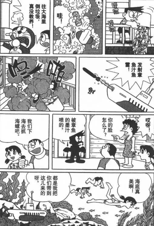 在家里操控潜水艇,一路从街道旁小河驶入大海的大雄,终于抵达了小夫他们所在的四丈半岛。此时,大雄发现小夫为了图方便把垃圾直接丢进大海,随后就发生了截图中的场景,哆啦A梦生气地说出那句“往大海里倒垃圾,真没教养”(随后对小夫发射了章鱼汁导弹)。