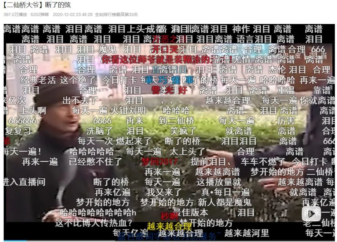 2020年12月2日,UP主“幺幺贰叁皮一皮”发布了人力VOCALOID鬼畜视频“【二仙桥大爷】断了的弦”,揭开了二仙桥大爷血洗B站鬼畜区的序幕。当此之时,B站原本正处于鬼畜“闪电五连鞭”马保国的狂欢中。但因不可抗力,马保国相关视频纷纷被禁,于是,兴起的“二仙桥大爷”迅速接过了马保国的接力棒。二仙桥大爷的爆红,存在一定偶然因素。
