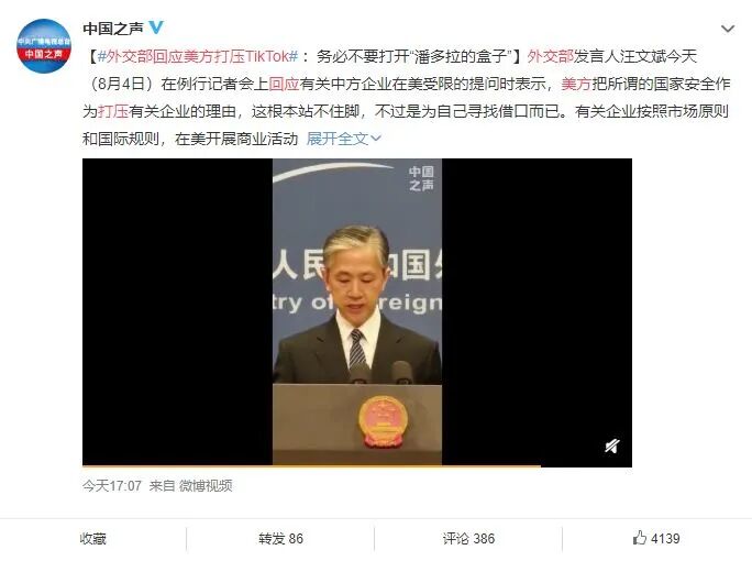 8月4日,据环球网报道,美国方面再次对TikTok施压,声称如果在9月15日前,TikTok没有出售给美国,那么必须关门。
