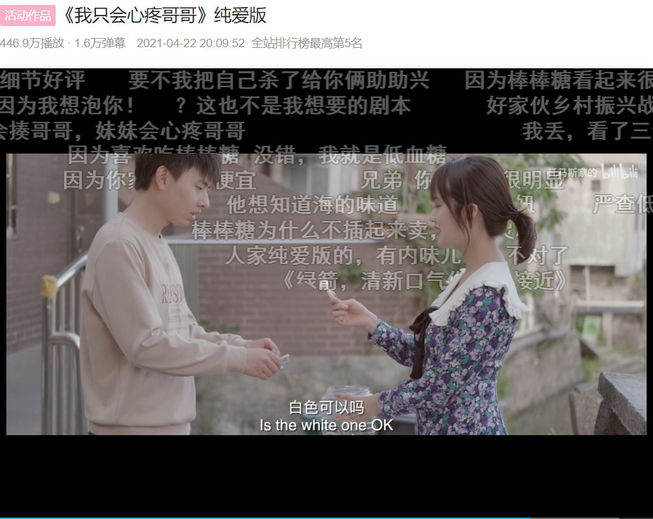 也有人通过扩写剧情的形式,为原本充满茶味的剧情重新设计主题,比如同样获得400多万播放的《我只会心疼哥哥》纯爱版,就将原本单调的骑电动车剧情,进行了重新润色,丰富成妹妹为了传达爱意,天天等待哥哥来买棒棒糖的纯爱剧情。套路虽然俗气了些,但味儿绝对是够正了。