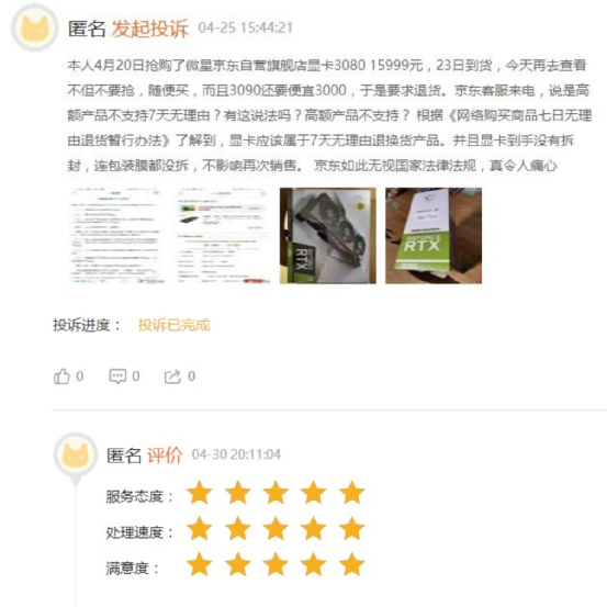 再看京东官方已经辟谣,而且不是所有的投诉都来自京东自营,并不能因此断定是京东有猫腻,第三方做出这种事情,虽然是京东监管不力,但全把怒火倾泻到京东本身,并不是恰当的行为。再者关于投诉的内容基本也都得到了回复,只不过考虑到货源紧缺的问题,无法换货的真实情况也是存在的。另外,黑猫投诉中也出现了疑似“矿老板”在天猫平台下单46张显卡被取消然后“贼喊捉贼”的事情。
