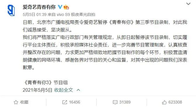 5月5日凌晨,爱奇艺紧急发布声明,表示坚决服从北京市广播电视局的相关要求,立即暂停《青春有你3》的录制。此时,距离《青春有你3》总决赛仅剩一周时间。