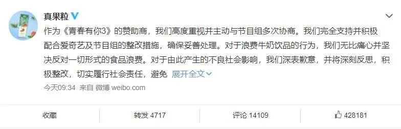 目前,《青春有你3》暂未公布复播时间,究竟选秀市场接下来何去何从,尚未尘埃落定。而发生在今年选秀中的这件倒奶荒唐事,在去年已经上演。法律是具有滞后性的,《反食品浪费法》虽然姗姗来迟,但亡羊补牢为时未晚。