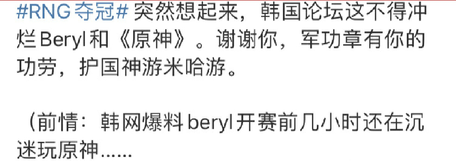 话虽如此,RNG夺冠真正靠的,还是自身强大的实力。所谓的“《原神》辅助”以及网络上疯传的“感谢米哈游”,只不过是网络文化下常见的造梗运动罢了。如果真以为RNG夺冠全靠BeryL这个“二次元内鬼”,或许就有些因小失大了。