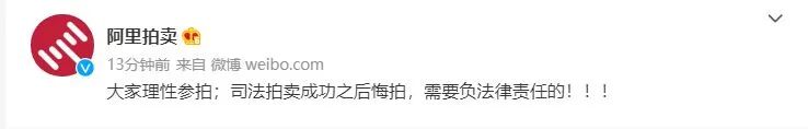 旋即,阿里竞拍主动中止了本场竞拍,给出的理由是“拍品与实际竞拍价格严重不符,可能存在恶意炒作与竞价行为”。