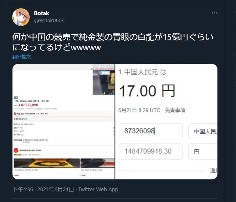 而熟悉《游戏王》的人都知道,海马濑人收购海马集团的时候,身价是10亿日元。如今,这张青眼白龙的价格,已经相当于14亿日元,不知道海马濑人看到这张拥有滁州市中级人民法院司法证书的青眼白龙,究竟会做何感想。
