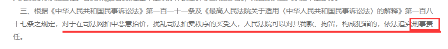 不仅如此,根据《中华人民共和国民事诉讼法》第一百一十一条及《最高人民法院关于适用〈中华人民共和国民事诉讼法〉的解释》第一百八十七条之规定,对于在司法网拍中恶意抬价,扰乱司法拍卖秩序的买受人,人民法院可以对其罚款、拘留,构成犯罪的,依法追究刑事责任。
