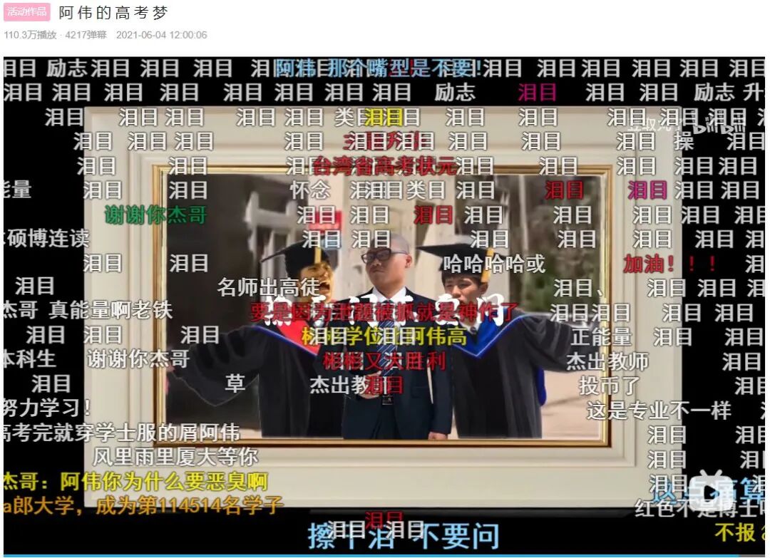 2021年6月4日,UP主“豆取丸了”发布了鬼畜视频《阿伟的高考梦》。都说最怕鬼畜动真情,《阿伟的高考梦》就是一部为高考学子打气、内容积极向上的鬼畜作品。UP主通过对素材的鬼马剪辑,杰哥热心帮助阿伟实现了高考梦,引得弹幕里飘过无数的“泪目”。