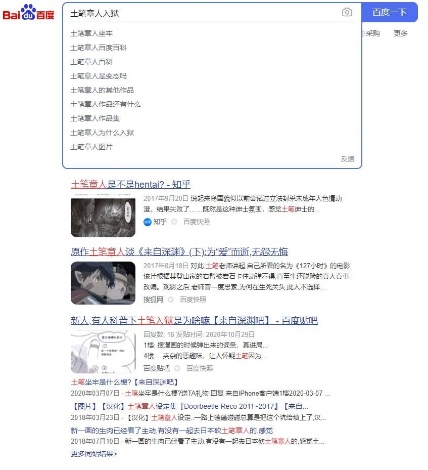 因为选用12岁左右的少年少女作为主角,土笔章人受到了不小的负评。其中大多数负面评价,都来自于漫画中出现的少部分大尺度画面。今天我们百度这位漫画家的名字,关联搜索会显示读者们半开玩笑的“梗”——“土笔章人入狱”。