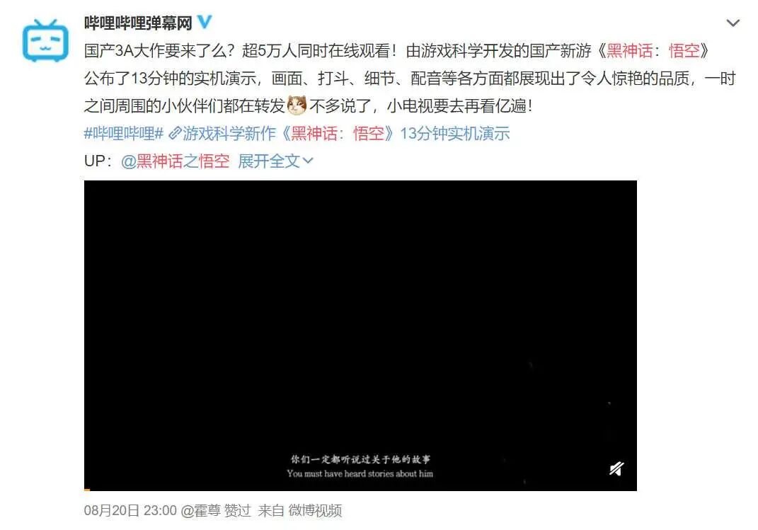 在微博上,游戏官方账号“黑神话之悟空”发布的第一条微博,也就是游戏的那段实机演示,毫无疑问已经成了近阶段,反响最为热烈的游戏行业相关微博。截至目前,这条微博已经获得了接近9万多的点赞,以及1万多条评论和4万多的转发。虽然这些数据,在以流量为主导的微博上,并不算多么惊人,相较明星偶像单条微博的流量而言,简直毫无可比性。但如果你平时关注过一些与游戏行业相关的KOL账号,就会发现这已经是非常惊人的数据。