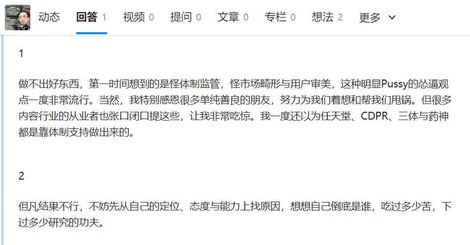 在《悟空》的演示放出后,冯骥在知乎“如何评价游戏科学放出的单机游戏《黑神话:悟空》实机演示?”这个话题下,发表了自己的见解。他聊了很多方面的内容,这些全部与《悟空》无关,而是更多关于自己对行业的看法,关于游戏从业者的工作态度、3A游戏的定义、西游文化。可以看出,这确实是一个用心在做内容的团队。他们有自己的理想,更有着自己的坚持。《悟空》的出圈,让他们收获了很多,但在最终成品面试前,他们还是要继续隐忍下去。