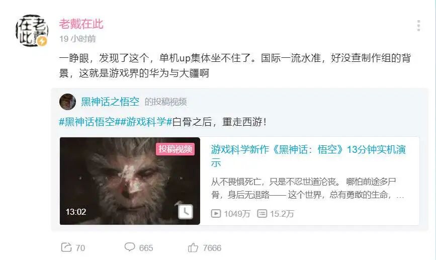 正如有玩家在视频底下留言所说的,我们当过猎魔人,当过侠盗,当过西部牛仔,但我们每个人的内心深处,都想真正当一次孙大圣。我们也都希望,国产游戏能真正站起来。