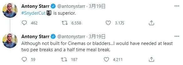 顺带一提,在剧中扮演大反派“祖国人”的演员,安东尼·斯塔尔在看过《正义联盟》导演剪辑版以后,也表示这比他之前看过的剪辑版要好得多,只是四个小时的时长,对他的膀胱进行了一次不小的考验。