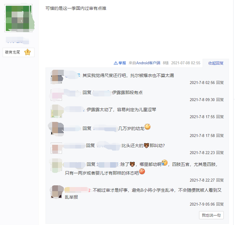 不过,无论是喜欢伊露露还是对伊露露无感的网友,最后讨论的焦点,大多都会回到动画能不能过审这件事上。部分网友认为动画从整体来看没什么问题,过审是能过的,但必然会遭到“和谐”,比如把整个身子“砍掉”,只留角色的头出镜;另一部分网友则觉得过审有点难,毕竟伊露露的形象,甚至有可能牵扯到儿童色情。