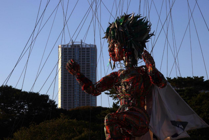 当人们还没从人头气球的震惊中回过神来时,一尊造型更为奇特的大型木偶,也很快加入到了,此次奥运会的民间整活中来。