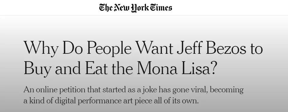 今年6月中旬,在杰夫·贝索斯还未宣布卸任亚马逊CEO之前,一条奇怪的新闻登上了美国新闻媒体“为什么人们希望杰夫·贝索斯买下并吃掉蒙娜丽莎”——一名美国男子发起请愿“希望杰夫·贝索斯买下画作《蒙娜丽莎》,并且吃掉它”。